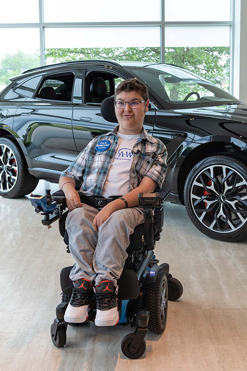 Martin, 17, of Tunas, MO, was born with spinal muscular atrophy and requires the use of a power wheelchair. Because Martin has a love of sports cars, the chair was presented at Holman Motorcars St. Louis, an Aston Martin dealership, where Martin was able to see the luxury cars up close.