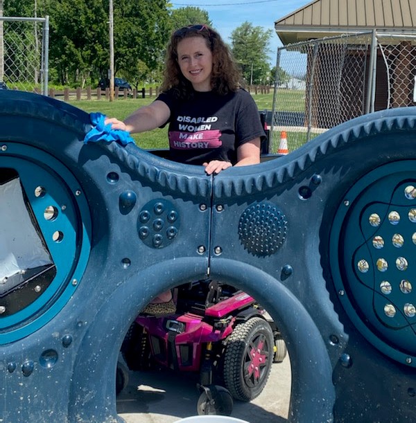 Over the past year, Santii and Endless Highway have worked tirelessly, even through the pandemic, to reach Santii’s goal of getting an accessible swing! They connected with Jill Moore White, an inclusive play specialist at Landscape Structures, Inc., who also uses a wheelchair. Jill introduced Santii and Endless Highway to different accessible playground options, specifically the We-Go-Round and the We-Go-Swing. The We-Go-Round is a merry-go-round with built in seating and open spaces for wheelchair users. It spins in circles when propelled by the kids (or adults!) playing on it. The We-Go-Swing is a swing that allows a power wheelchair or manual wheelchair user and ambulatory kids to play together.