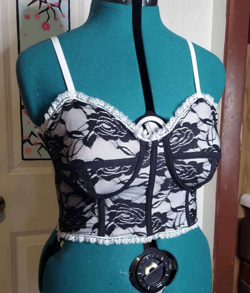 Yesterday, I finished a gorgeous white and black lace bustier top that is fully lined underwired, cupped and boned, but has absolutely no finicky closures to it and it slips over my head! In a world where there isn’t much comparatively for accessible clothes, having the skills so that I can create my own is something that I’m super proud of.