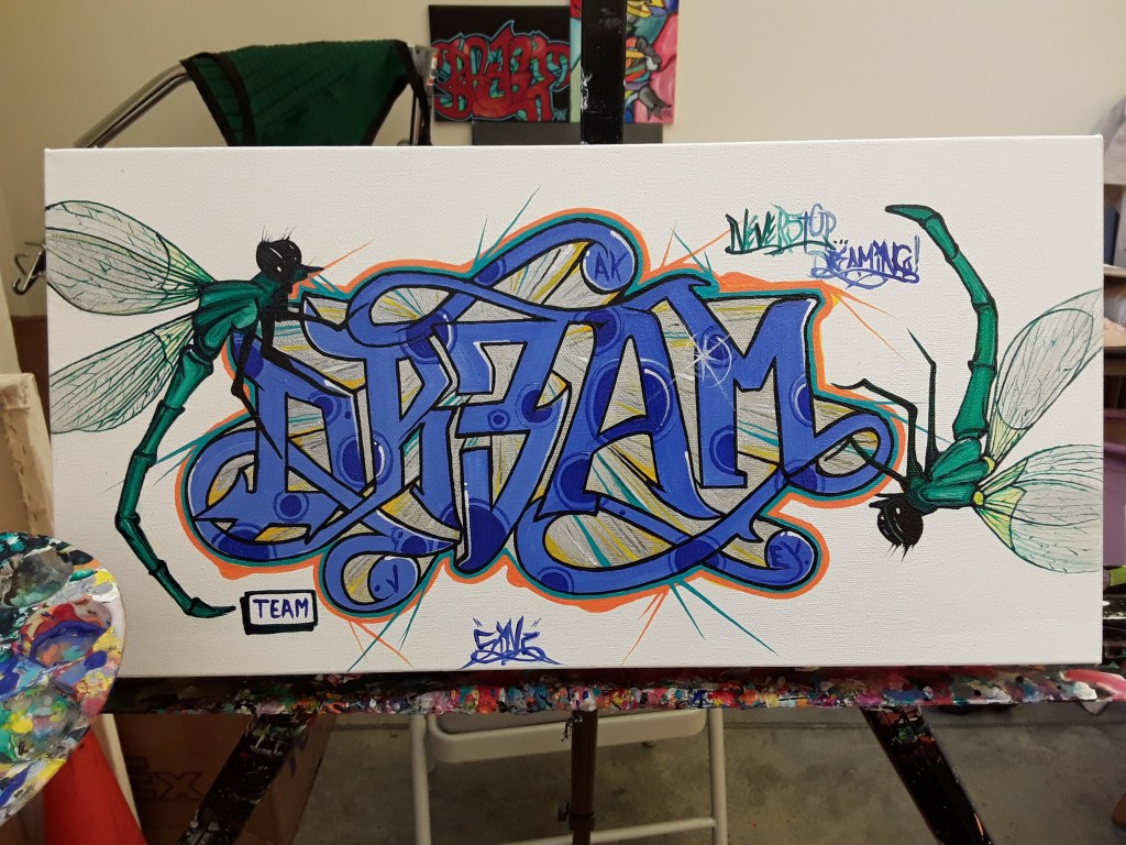 Fast forward to after my accident. I had to relearn how to sketch and paint. I started using a paintbrush for the first time on canvas. This was a different texture, a different kind of paint and just a whole new world for me. It’s so different from spray paint. Now, don’t get me wrong. I’m so appreciative for my abilities and being a mouth painter. I’m still learning, even after 12 years. Unfortunately, mouth painting doesn’t feel the same as spray painting. Yes, I can mix and manipulate colors but it doesn’t have the same feel. A spray can has so much more grace that can create shapes in the sprays. There’s nothing else like it.