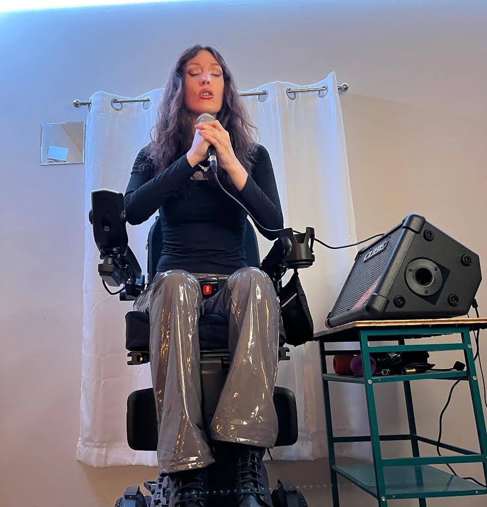 I’ve performed for 10 years in this city as a wheelchair user. None of the stages I’ve performed at (aside from the disability community and college events), are wheelchair accessible. I need to go down in front of the stage to perform. In a power wheelchair, you’re already at a lower height than your standing audience. So, without even a stage, you are completely hidden. I’m tired of people coming up to me after a set and saying: “I heard you singing, but I didn’t see anyone onstage so I thought it was a recording. Then I realized you’re just down there in a wheelchair.”